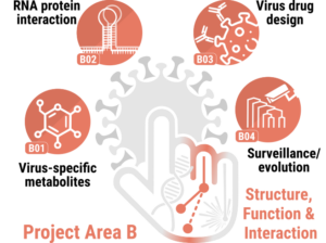 We have recently developed techniques that allowed us to predict the emergence of relevant variants of SARS-CoV-2, as reported by the World Health Organization (WHO), substantially prior to this classification and to their reaching their maximal abundances. We are also able to identify lineages with substantial antigenic alterations, which can inform considerations regarding vaccine strain updates. In this project, we will combine data-driven analytics of population-level virus diversity with molecular modelling across scales to link macroscopic virus evolution on a population level to molecular processes within the cell. By combining data-driven surveillance and simulation, we will be able to study evolutionary and epidemiological phenomena in both data and models, see Fig. B04.1. These include: (1) Developing approaches for early detection and further characterisation of antigenically or otherwise phenotypically altered lineages identified by the WHO as Variants of Concern (VOCs) via virus genomic surveillance (G3). Early detection methods for identifying antigenically altered lineages classified by the WHO as concerning, of interest, or under monitoring have recently been developed in the McHardy lab.