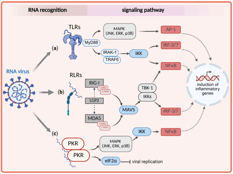 Viral RNAs trigger the innate immune response, which is able not only to distinguish foreign RNA from the cell’s own diverse complement of RNA molecules, but also varies among viral pathogens. Macrophages act as the first line of defence against invading viruses and are pivotal for the innate immune response, crucially regulating the entire inflammatory process during viral infections. Single- or double-stranded RNA viruses are recognised by several classes of RNA-binding proteins, in particular, the RNA-dependent toll-like receptors (TLR), TLR-7 and TLR-8, the RIG-I-like receptors (RLR) RIG-I, MDA5, LGP2, and their homologues, and the double-strand sensing protein kinase R (PKR). While individual RNA ligands of these sensory proteins have been well studied, a comprehensive and comparative understanding of their evolutionary and structural diversity across viral groups remains lacking.
