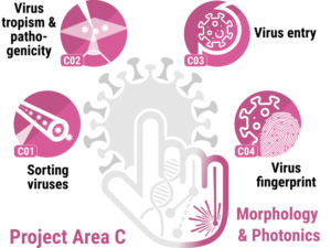 In Project Area C, we will therefore explore straightforward and accurate approaches for investigating molecular details during virus entry and uncoating, precise determination and discrimination of virus morphology and virus surface, establishment of non-specific or label-free imaging of viruses and host cell responses, and sorting of viruses.