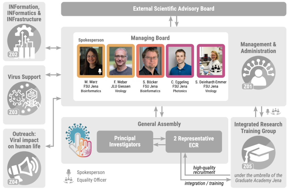 Governance of CRC VirusREvolution. The governance of the CRC is formed by a managing board, Fig. Z01.1, comprising the spokesperson M. Marz (A04) and the four co-spokespersons, of which F. Weber (A03), S. Böcker (B01), and C. Eggeling (C01, C03) represent the three focal areas, and S. Deinhardt-Emmer (C02) our main local virologist and Gender Equality Officer. The board meets twice a year to evaluate the project progress and to plan scientific meetings. It is responsible for devising and implementing measures to promote the CRC towards its scientific objectives.