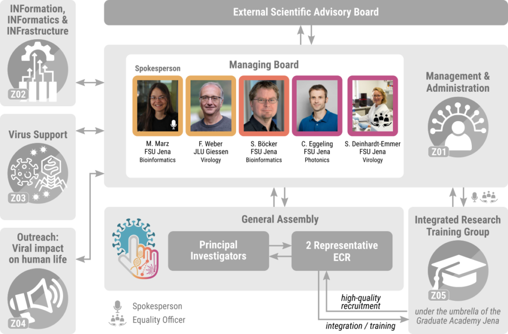 Governance of CRC VirusREvolution. The governance of the CRC is formed by a managing board, Fig. Z01.1, comprising the spokesperson M. Marz (A04) and the four co-spokespersons, of which F. Weber (A03), S. Böcker (B01), and C. Eggeling (C01, C03) represent the three focal areas, and S. Deinhardt-Emmer (C02) our main local virologist and Gender Equality Officer. The board meets twice a year to evaluate the project progress and to plan scientific meetings. It is responsible for devising and implementing measures to promote the CRC towards its scientific objectives.