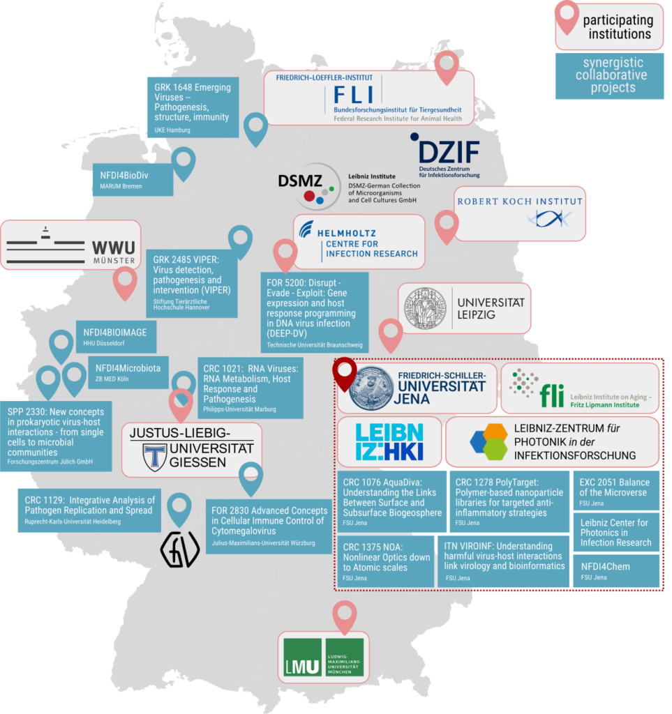 VirusREvolution will play a central role in the German virus research landscape. Our PIs are involved in further collaborative projects with researchers from other German universities and institutions. The selected scientists from outside Jena play leading roles on a national and international level. The results from VirusREvolution will be of high interest to other research groups and national institutes within and beyond Germany, for example, the German Center for Infection Research (DZIF), the German Collection of Microorganisms and Cell Cultures (DSMZ), federal institutes Friedrich Loeffler Institute (FLI), and Robert Koch Institute (RKI), and the Helmholtz Centre for Infection Research (HZI). The map of the CRC VirusREvolution network shows connections to the national research community, with synergistic effects. Substantial links to the NFDI consortia, expeciall NFDI4Microbiota, NFDI4Biodiversity, NFDI4BioImage, and NFDI4Chem are established.